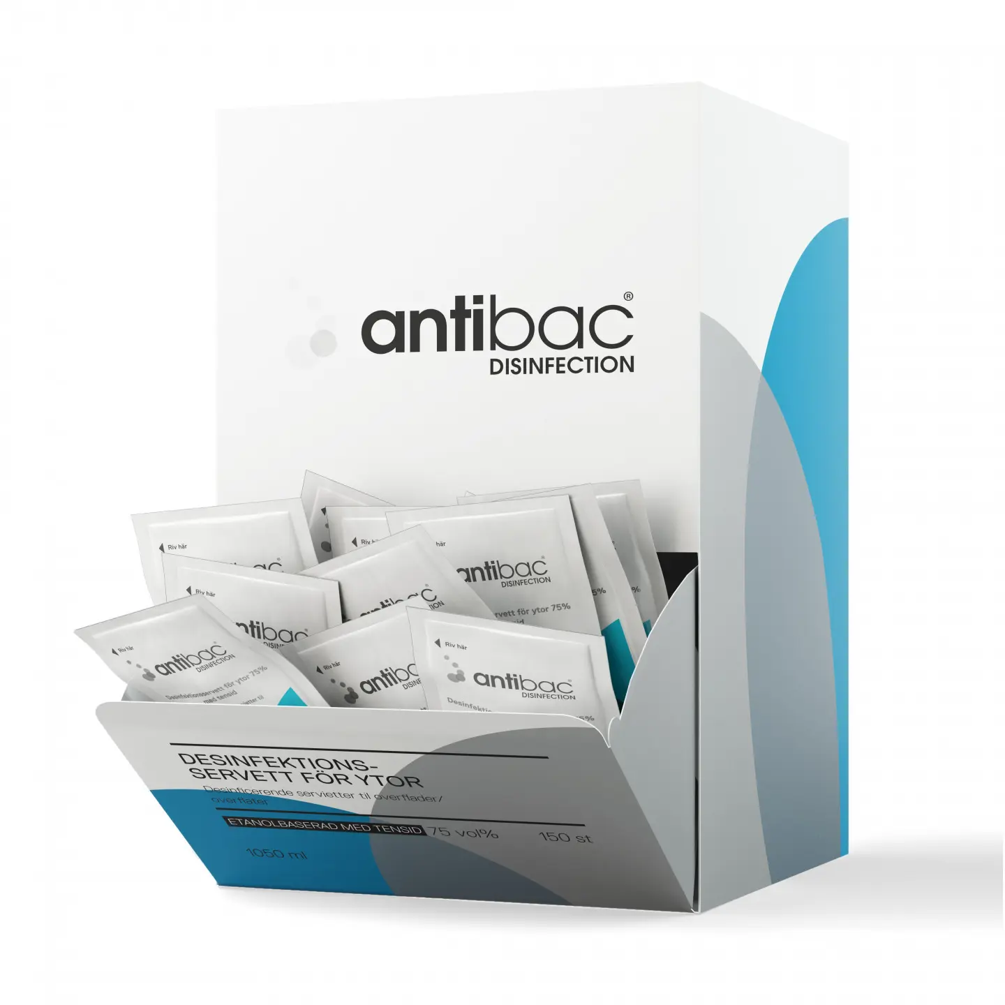 Antibac singelpackade ytdesinfektionservett med tensid är avsedd för desinfektion av mindre ytor som t.ex toalettsitsar, dörrhandtag etc. Har effekt på bakterier, svamp, alla höljeförsedda virus samt vissa nakna virus som t.ex. Adenovirus och Murine Norovirus. Produkten består av ca 75 vol% denaturerad etanol samt tensid. Servetten är av god, tålig kvalitét och är 17 x 22 cm.